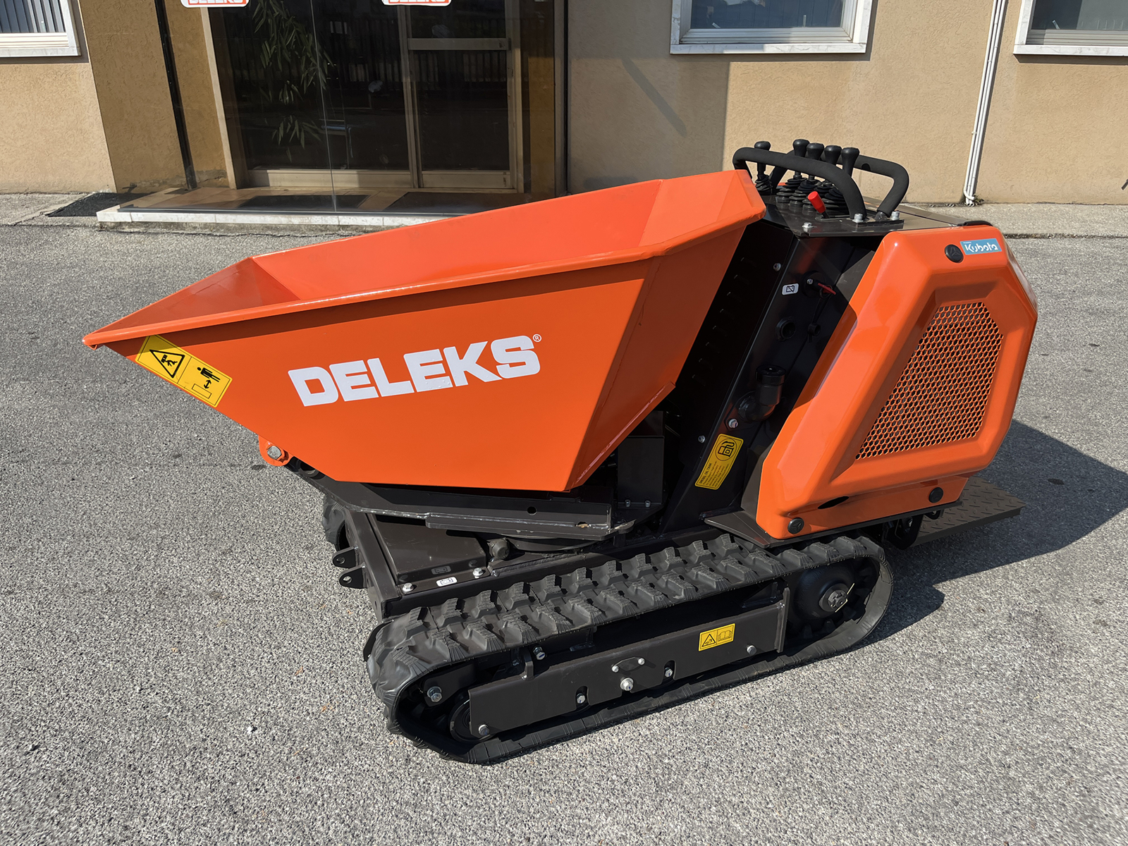 DELEKS® M8000R-KUBOTA professional tracked mini dumper with 180° three-way discharge, hydraulic lift and rotation, hydrostatic transmission, operator platform and Kubota diesel engine with electric start.