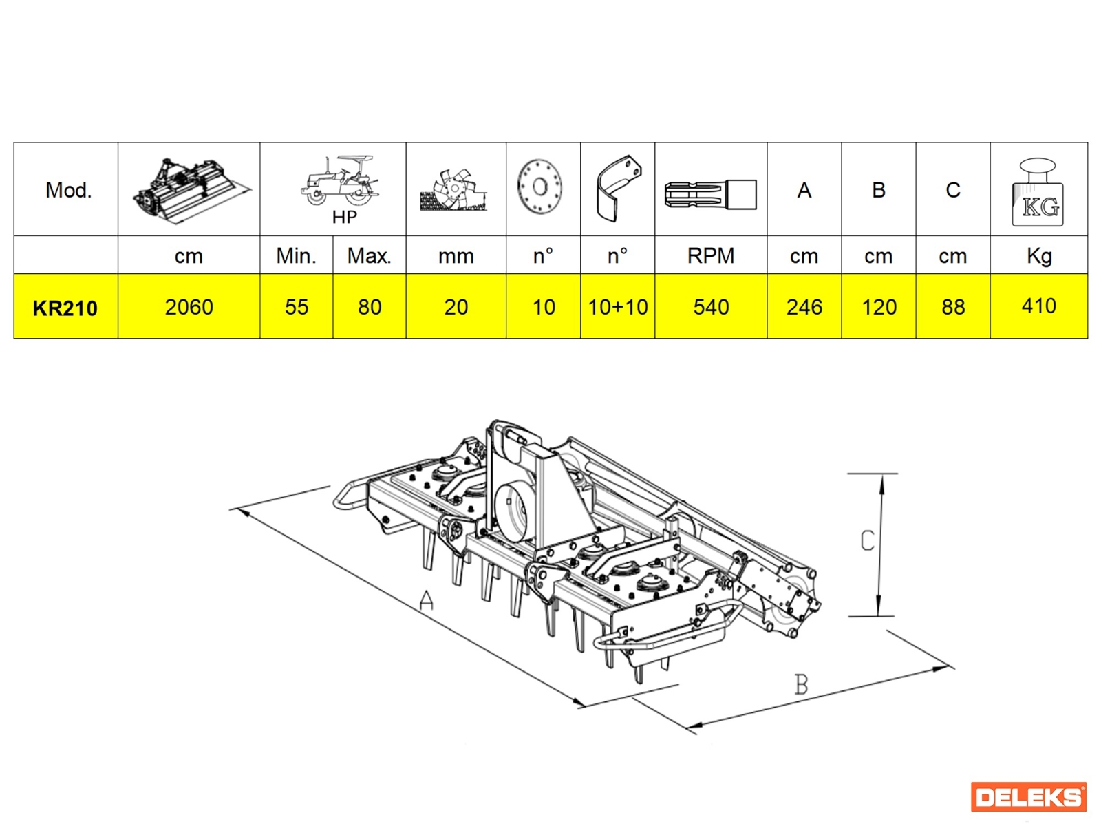 DELEKS® Power Harrow 206cm for tractors from 55 - 80 HP, equipped with standard rear cage roller (grit roller available as an optional) and single speed gearbox for P.T.O. 540 r.p.m.