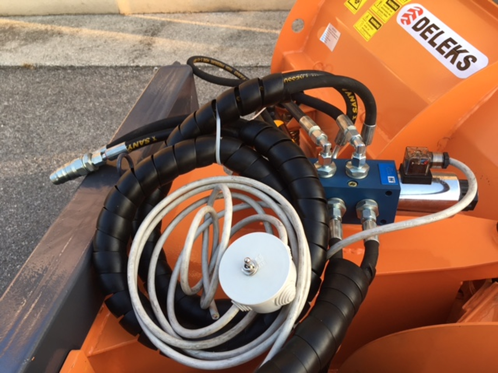Angling of the plow is done hydraulically using two pistons, a 6-way solenoid valve and two hydraulic pipes (2.0m).