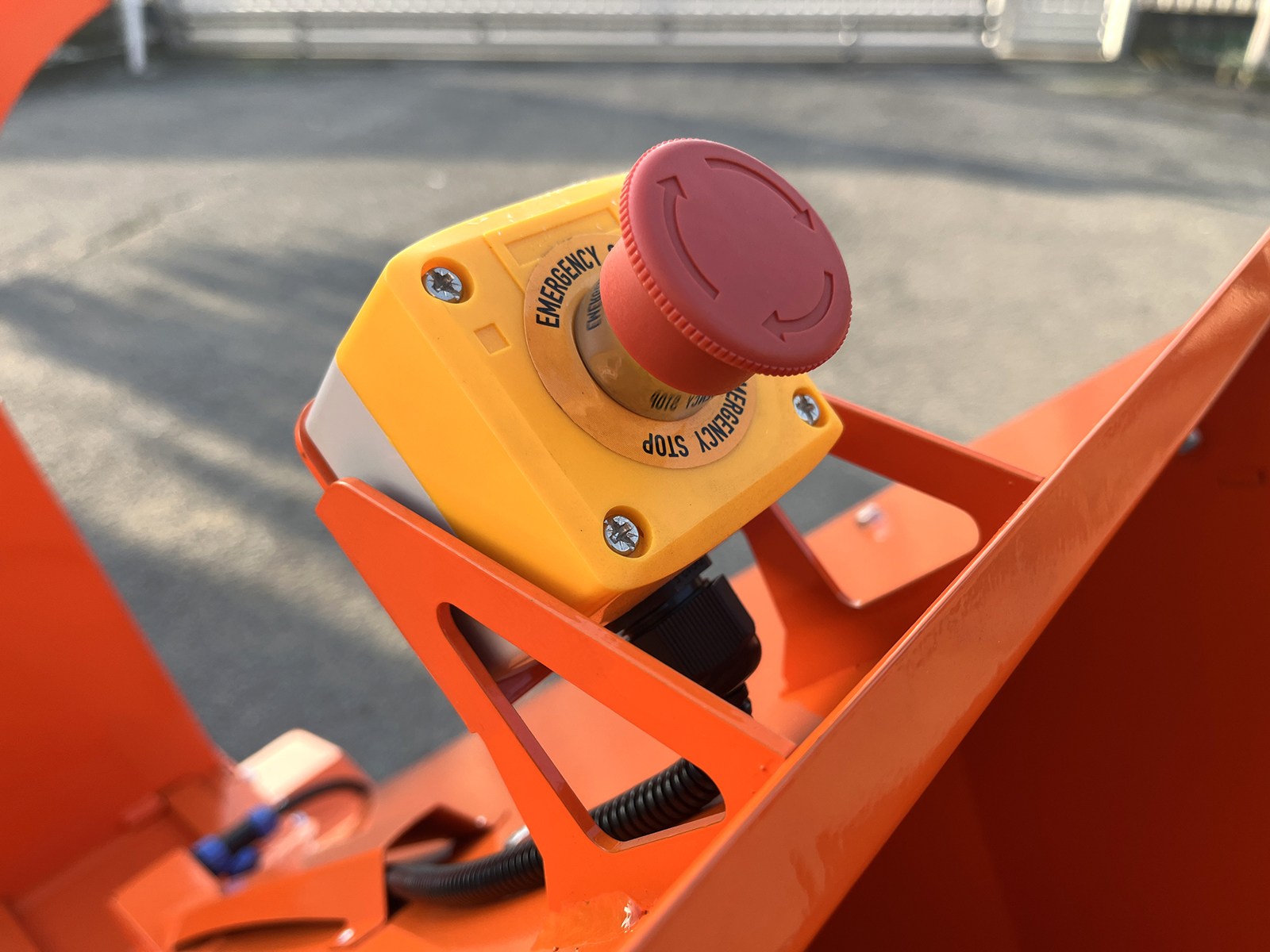 The machine is equipped with a mushroom-type emergency stop button that immediately shuts down the engine in case of emergency. A safety sensor prevents the wood chipper engine from starting if the discharge chute is removed. The feed hopper can also be folded, preventing the cutting system from being exposed when the machine is parked or during transport.