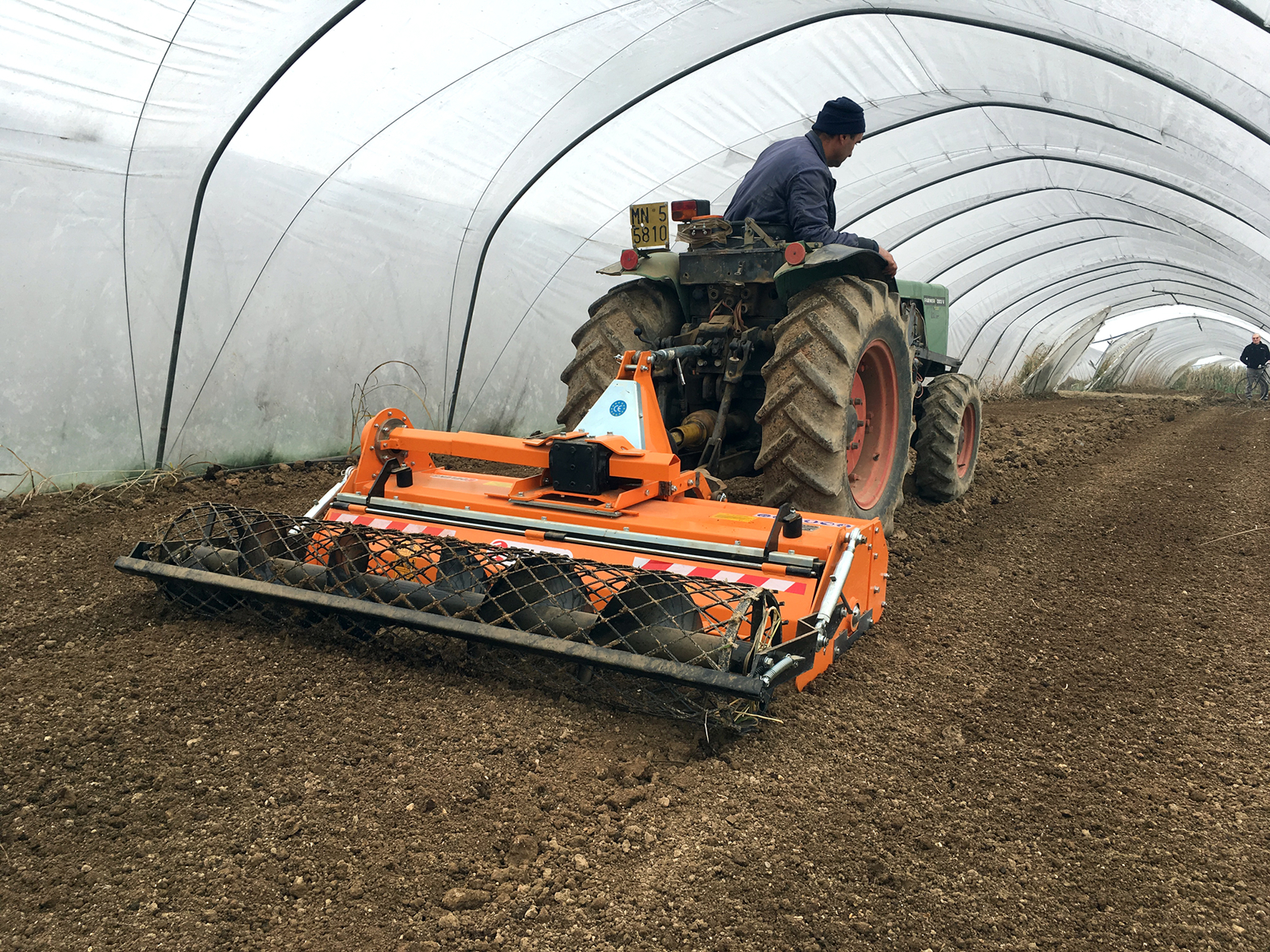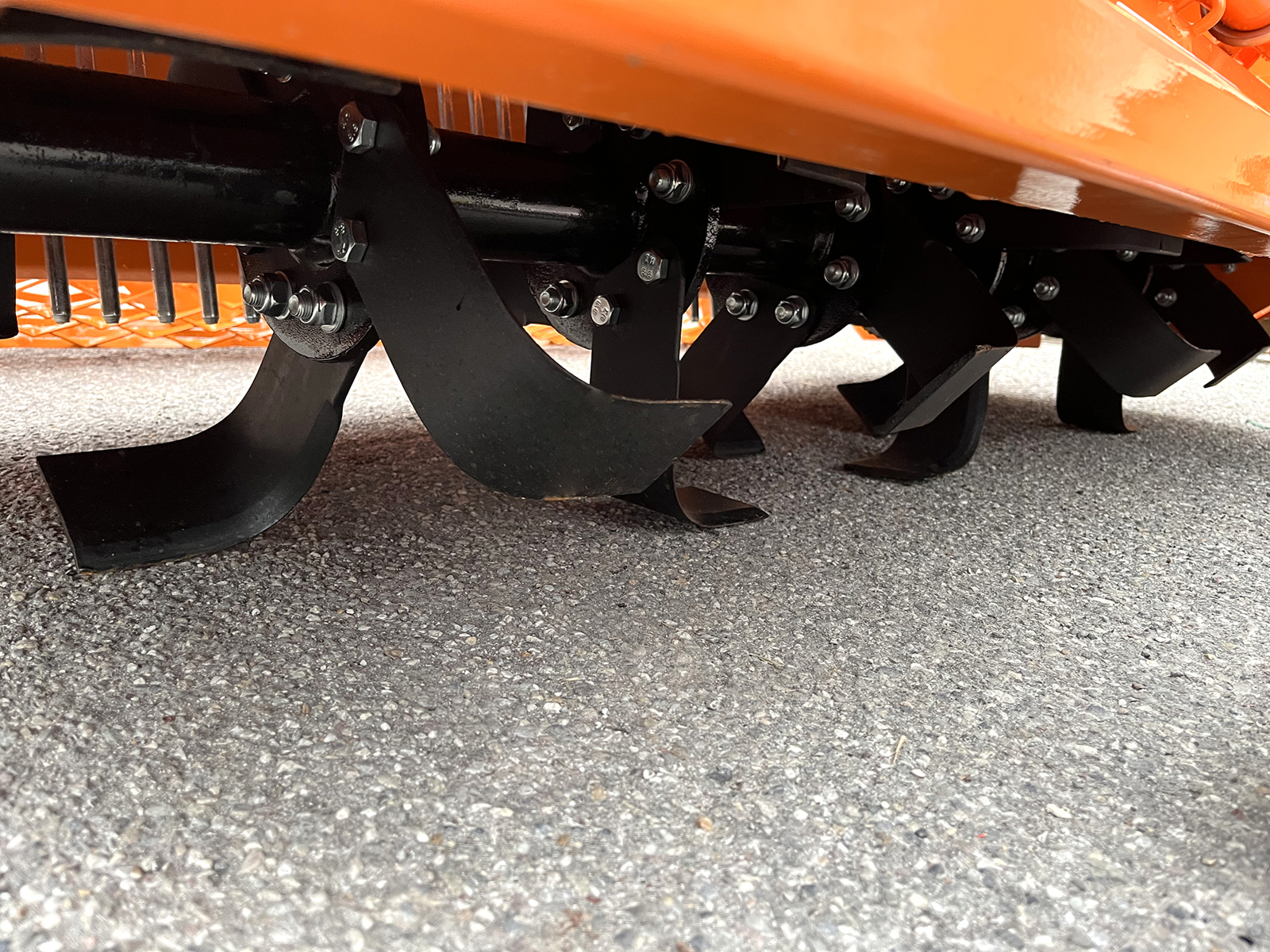 DFU-140 Stone burier for compact tractors 30-50hp e.g New Holland Boomer 30-40, John Deere 3-4 Series, Kubota L, Lamborghini, McCormick, Carraro, Goldoni, etc. The DFU-140 Stone-Burier is the perfect machine to prepare a smooth seed bed in any type of soil, including heavy soils and hard clay. It has been designed for greenhouse cultivation, preparing the soil for planting, flower beds and gardens. Single Speed Gearbox with 540 RPM PTO, Chain Side Drive. Delivered assembled (except 3 point linkage and rear roller) and greased, Gearbox filled with oil.