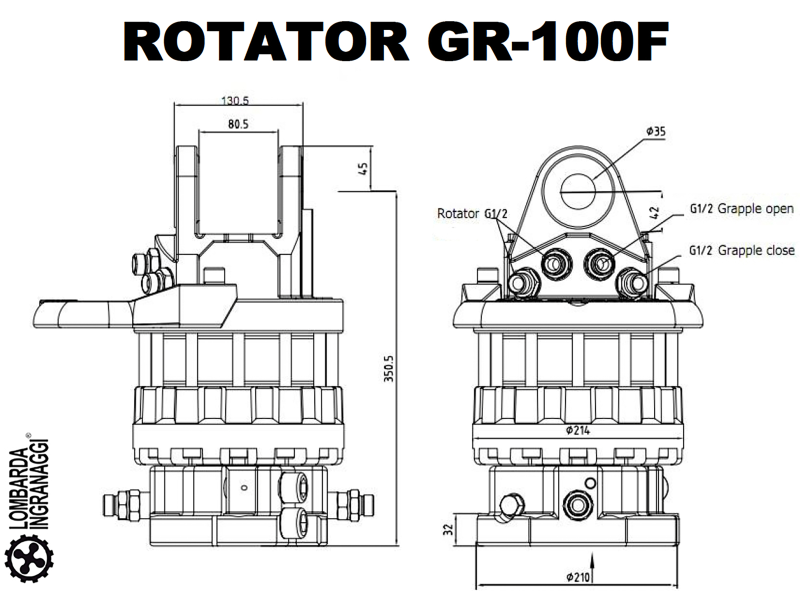 Rotator: Lombarda Ingranaggi's GR100F rotators are powerful, reliable and robust. They are engineered to perform in heavy duty work environments with maximal efficiency and minimal unscheduled downtime as they have a loading capacity 10.000kg. Grapple needs 4 hydraulic outlets to function. EC Conformity, 2 Year Warranty.